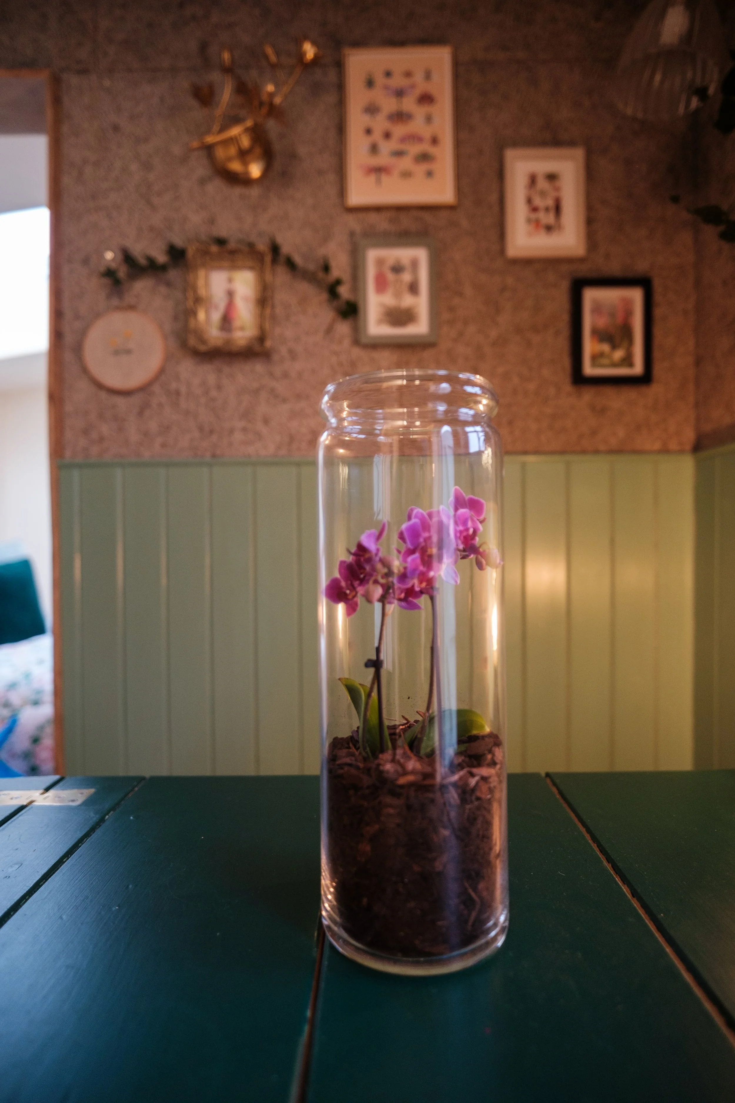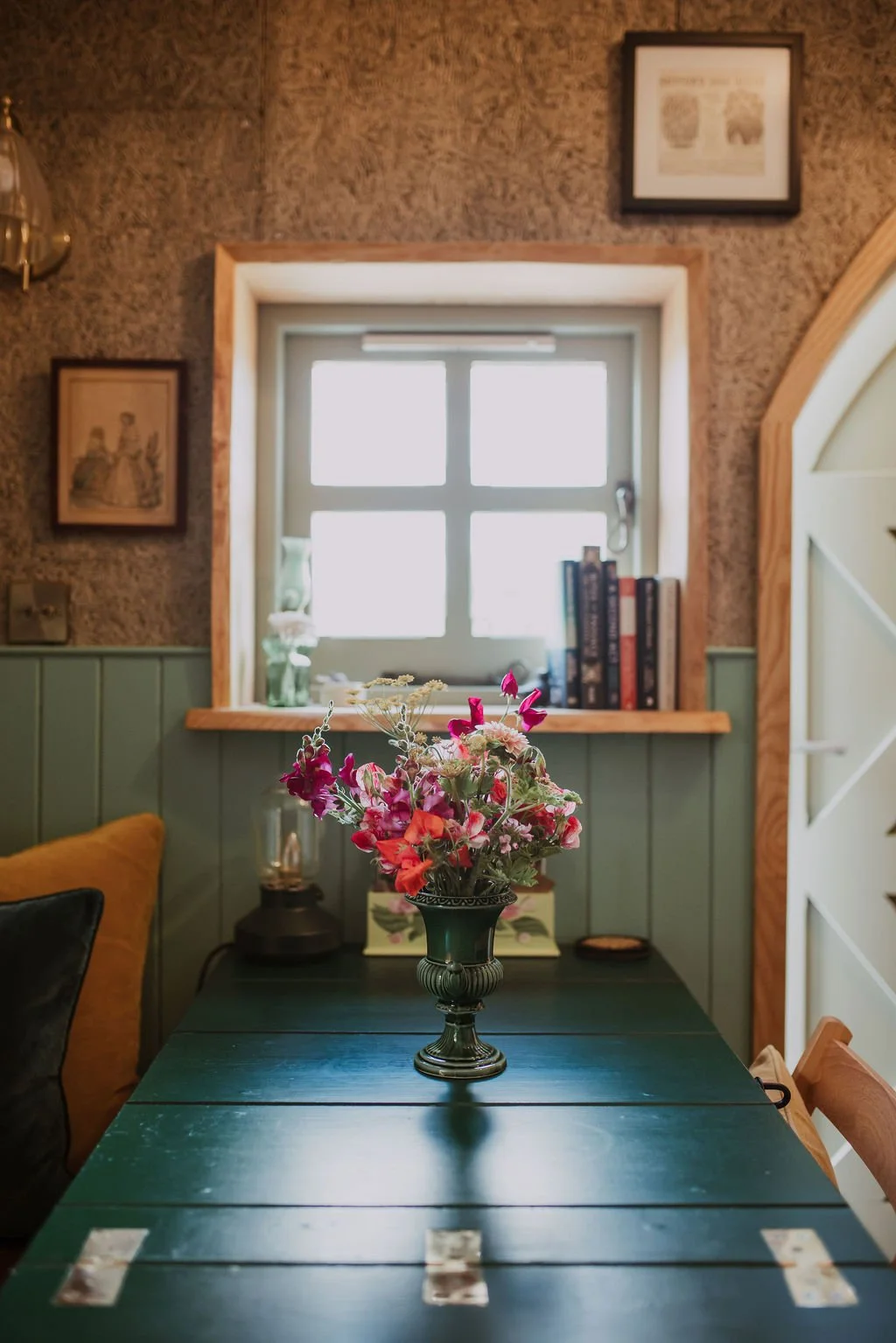The stained glass window in the bathroom, with its reaching vines and central rose etching, is an homage to these women and their thirst for knowledge and new experiences. While the vivid mural in the bedroom, by local artist Droobie, offers a contemporary take on the Victorian quest for exploration.